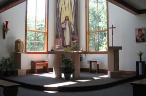 A large Gathering Room with a beautiful fireplace is available for guests. A simple, quiet chapel is used for celebration of Mass, staff prayer, prayer gatherings, and personal quiet meditation.